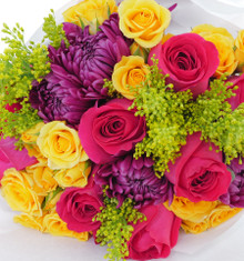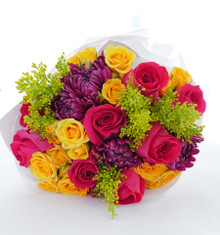 Bouquet of bright and cheery flowers, with a wild spirit. Mix of bright pinks, deep purples, and poppy yellow.