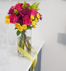 Bouquet of bright and cheery flowers, with a wild spirit. Mix of bright pinks, deep purples, and poppy yellow.
