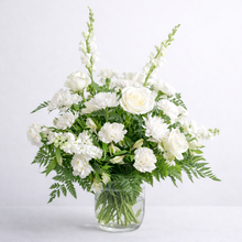 Express your condolences, caring, and support with this fresh flower arrangement in peaceful whites, arranged in a clear glass vase.